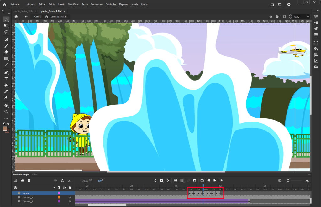 Na imagem, o quadrado vermelho destaca uma sequência de pontos pretos na linha do tempo da animação, sendo que cada ponto preto representa um desenho. Esse momento retrata a água batendo na tela, e o leitor pode conferir no link abaixo (no minuto: 1min 17seg).