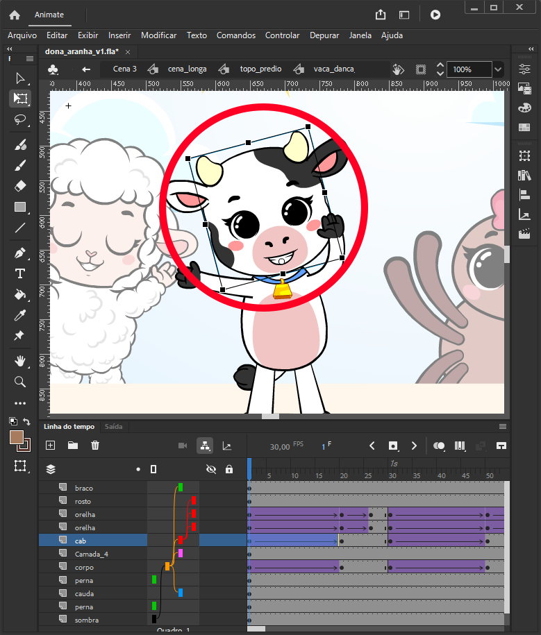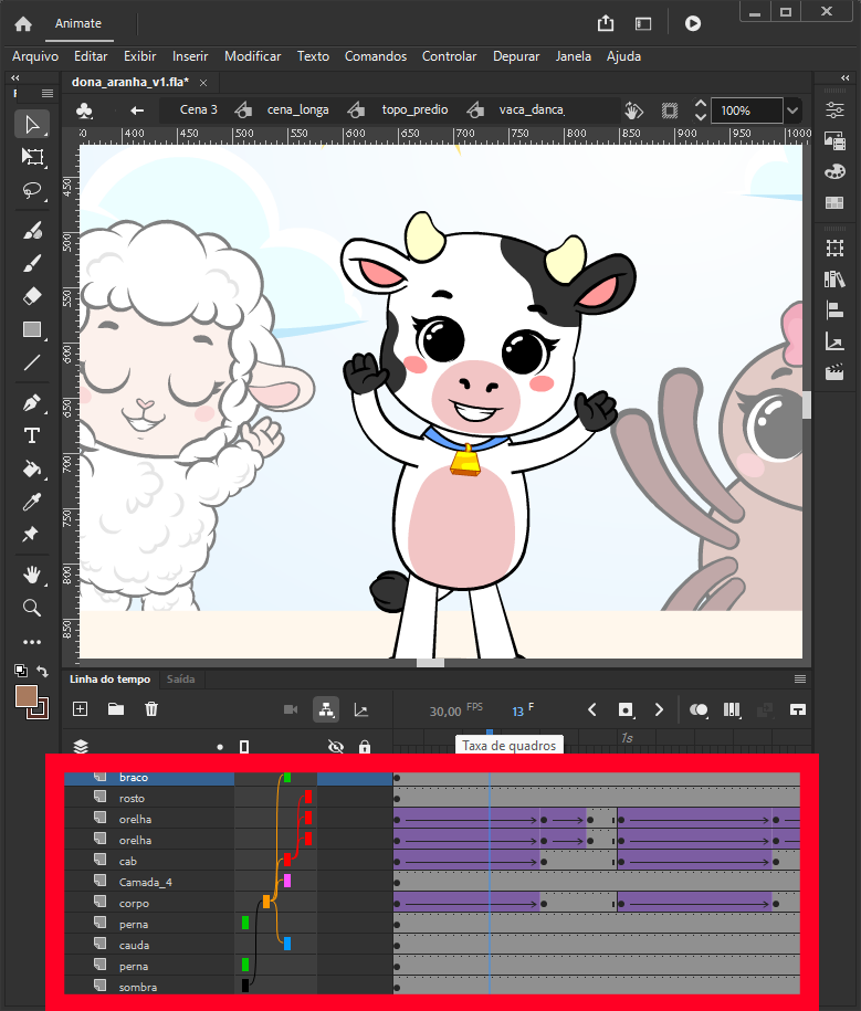 Na imagem, em destaque, vemos a linha do tempo da animação. À esquerda, é possível identificar várias partes do corpo e como o software conecta cada uma delas. Por exemplo: orelha e rosto estão ligados a “cab” (abreviação de cabeça), assim, ao movimentar a cabeça, o software automaticamente move tudo o que estiver conectado. À direita, aparecem faixas roxas e os conhecidos pontos pretos. Os pontos pretos são os quadros-chave, enquanto o roxo representa a interpolação feita pelo software. Note que não é necessário ter muitos pontos pretos, pois o software completa o movimento para o animador.